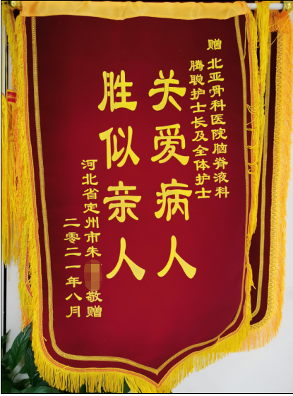 患者朱XX,赠送十病区护士长滕聪及全体护士锦旗一面。